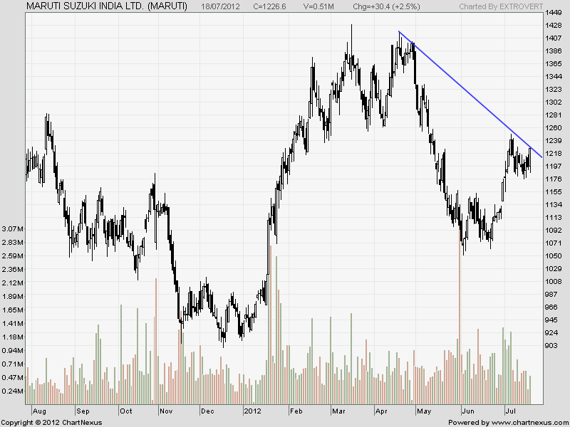 Maruti is near its trendline resistance breaking the same will make it go till 1250,unable to do the same will pull it back till 1175