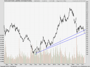 Tata Motors has formed a Hammer Candlestick pattern which do indicate a reversal is on cards. Telco has taken support near crucial trendline support at 218.