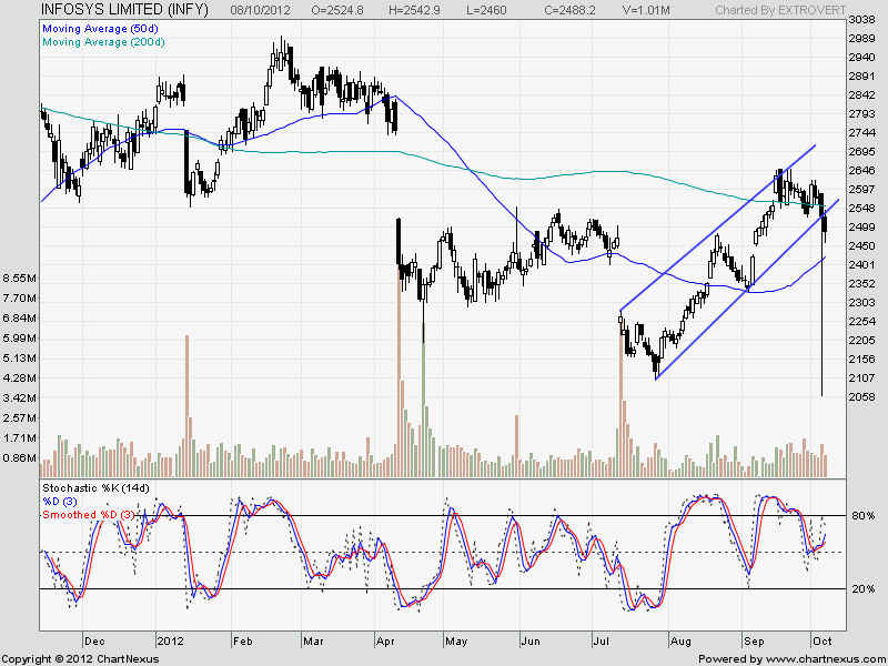 Infosys will be declaring its results on 12 Oct. Stock look weak on technical charts and has broken the channel on downside. Infosys is trading below its 200 DMA which is giving bearish signal