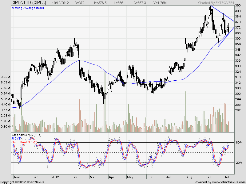 CIPLA is at its important support of symmetrical triangle and 50 SMA. Close look at chart shows 50 SMA has provided important support during the rise of 285-395.
