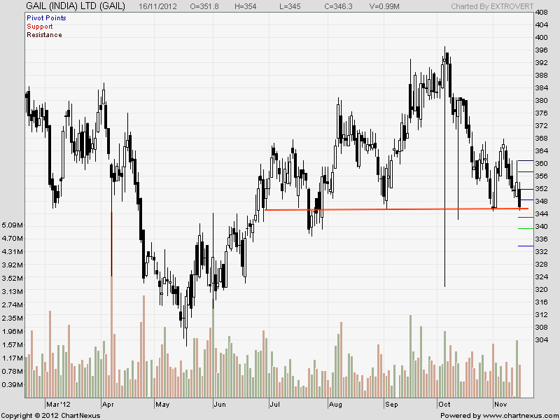 Gail has formed a Head and Shoulder pattern with neckline at 345.Break of same can lead to 300 odd levels in short term.