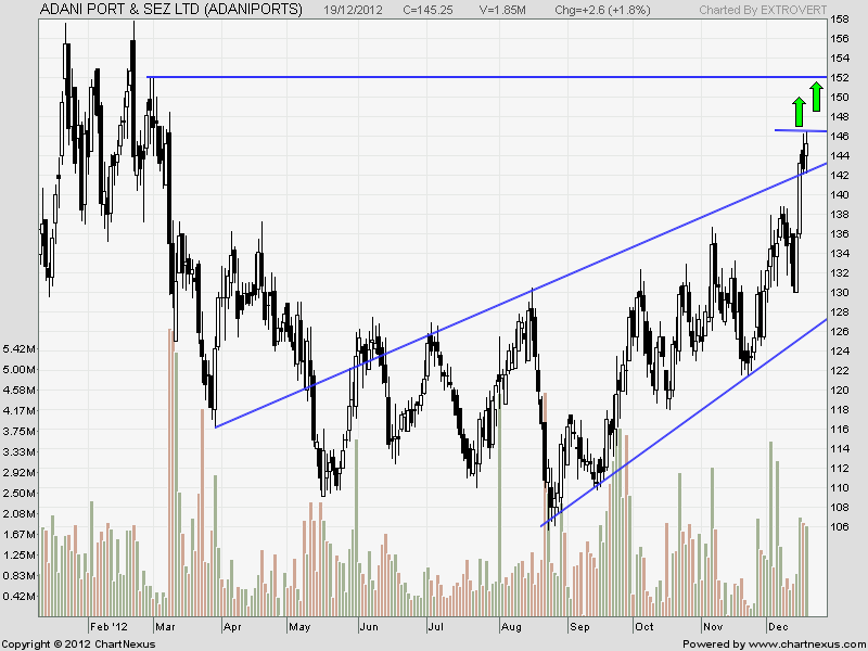 Adani Port has seen a spectacular rise from 130-146. Stock broken its channel on upside and is now facing resistance at 146, Break of same can lead to 152 odd levels.