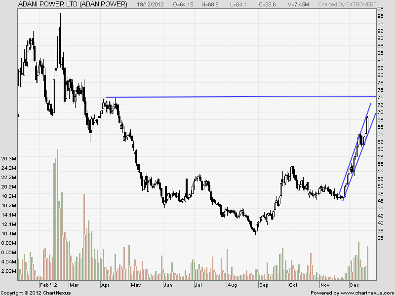 I am currently holding position in ADANIPOWER, and as per support/resistance theory… if we join line from one bottom (earlier one) and one small peak, then this treandline reaches at 70lvl..which is also sphycological level..