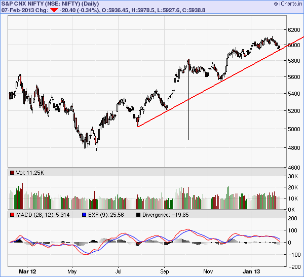 3. NS closed at 5939 after opening gap down on weak global cues making high of 5979 and low of 5928.Nifty made the high near our first resistance of 5982 and low near our second support of 5930 as discussed yesterday . Tomorrow is a weekly closing and very important session of trading because Nifty has formed Gravestone Doji pattern near the ascending trend line support of 5925, This trendline has been giving support to Nifty from low of 4770, Will this time also will it Hold, Answer lies in tommrow trading session.