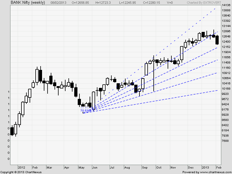 Fibo Fans has been applied on Bank Nifty weekly charts and its show 12190 emerging as support,which can give some short term pullback.Sustainability of pullback will still be questionable?