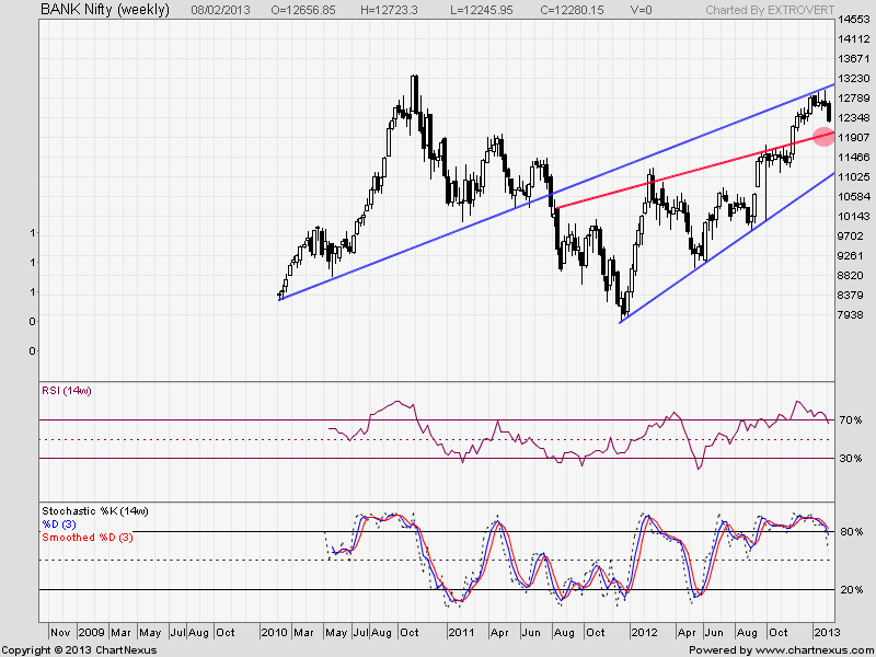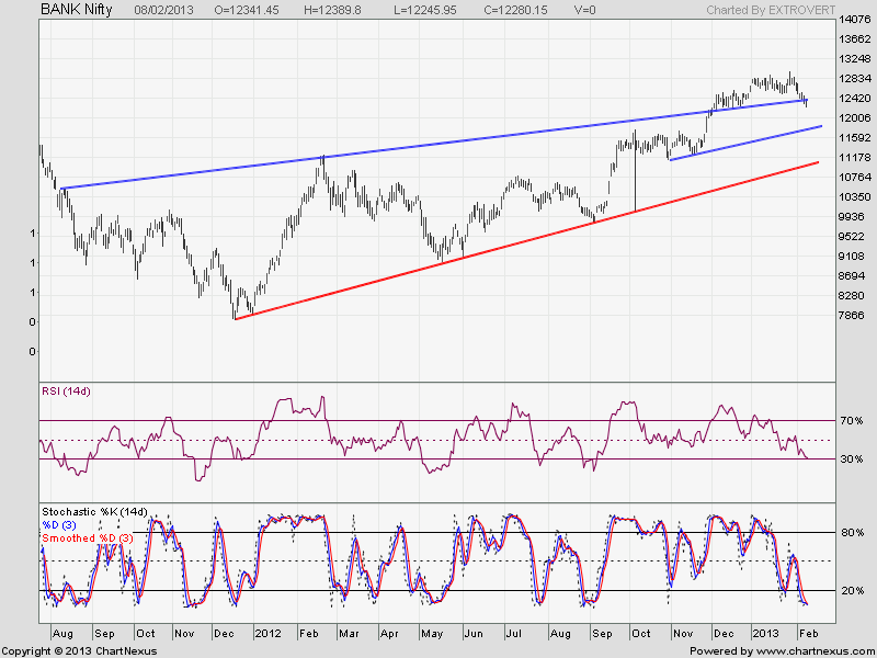 Bank Nifty also broke its short term trend line support at 12390 and closed below it.Unable to cross 12390 for 3 trading days can sell fall in bank nifty till 11750 odd levels in 2 week time frame, mostly before budget. SBI holds key when it comes out with its results on 14 Feb.