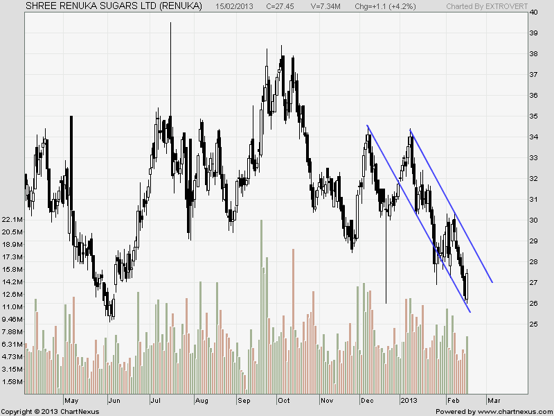 Renuka Sugar has been on rise with sugar decontrol news on the cards. Stock is again trading in downward channel touched lower channel and bounced back forming an Bullish engulfing pattern.