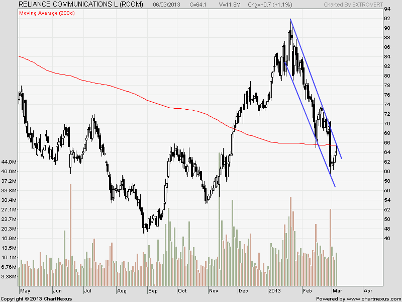 Rcom share value reacted from its 200 DMA today @66.3 and formed doji pattern with trading in a firm down trending channel.