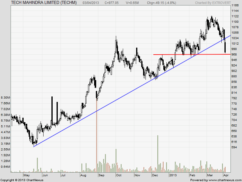 Tech M also broke its long term trendline tried to move over the trendline but got sold off. Stock is near an important supply zone of 972-965, unable to hold the support stock can extend the fall all the way to 920 odd levels in short term.
