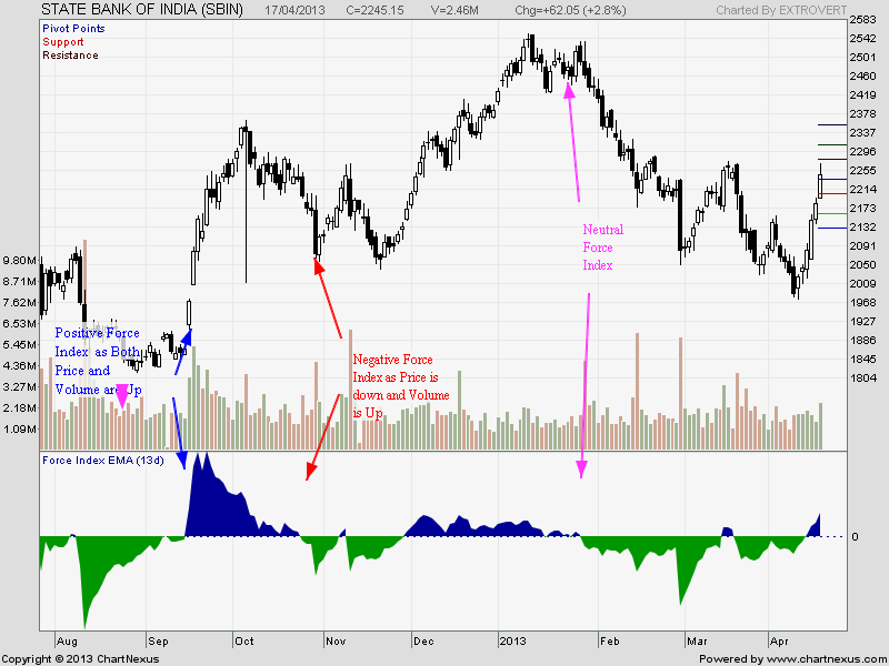 Force Index 1 data will be full of noises and data will not be in readable format, Therefore Traders generally uses 13 Period EMA for a smoother and readable data.Volume plays a critical role in Force Index as shown in above formula. A big move on big volume produces a high Force Index values confirming the validity of move. Small moves on low volume produce relatively low Force Index values singalling whipsaw can happen.