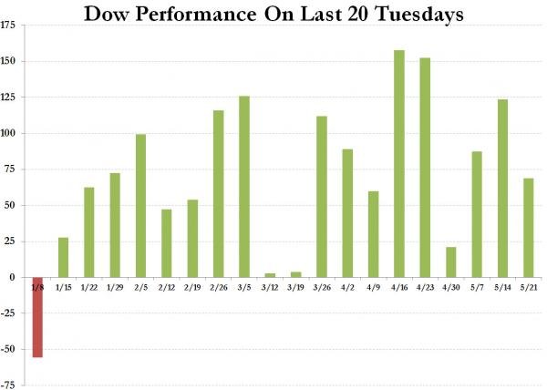 As a gentle reminder, since February 1st, the Dow has gained 9.85%; absent Tuesdays it is up a mere 0.5%. It was on Tuesday on Dow Jones closed above 15000.