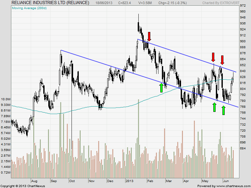 Reliance is trading near its downward falling trendline resistance,200 DMA and formed a DOJI candlestick signalling reversal is on cards.For Positional trader Buy can be done with close above 836 only for target of 847 and 858. Till 836 is not crossed stock will remain in Sell on Rise category.Intraday traders can use the below levels to trade