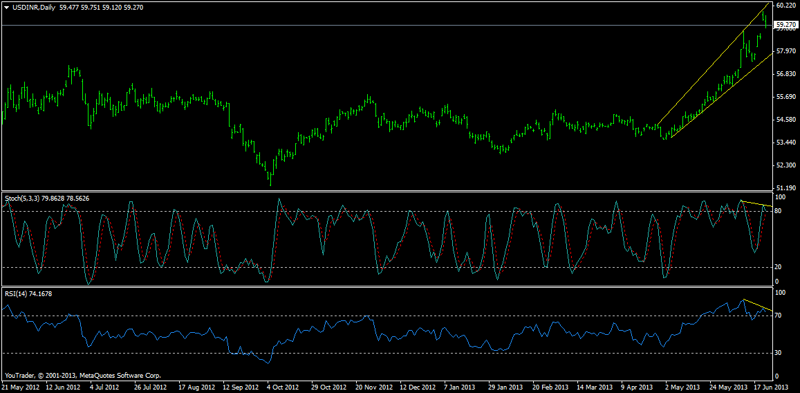As per Daily charts IN is forming rising wedge pattern which is bearish in nature, Negative divergence are visible in RSI and Stoch. Unable to cross 60 on Spot rupee can see a slide near 58-57.5 odd levels in medium term.