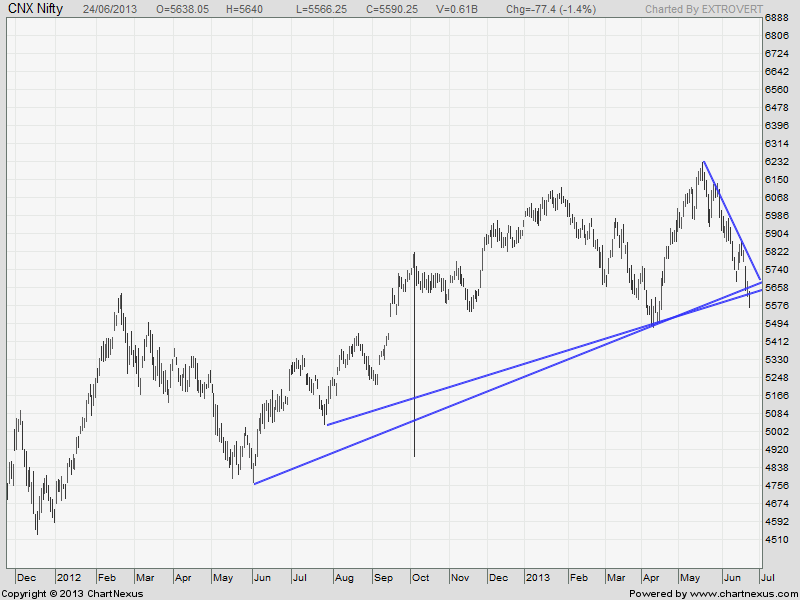 - Today Nifty opened with gap of 30 points and kept on sliding down, broke and closed below 5600. In the process also broke the trendline support as shown below. Nifty has entered very crucial demand zone of 5558-5584, so a relief rally can be expected in next 2days if 5558 is not broken on closing basis.