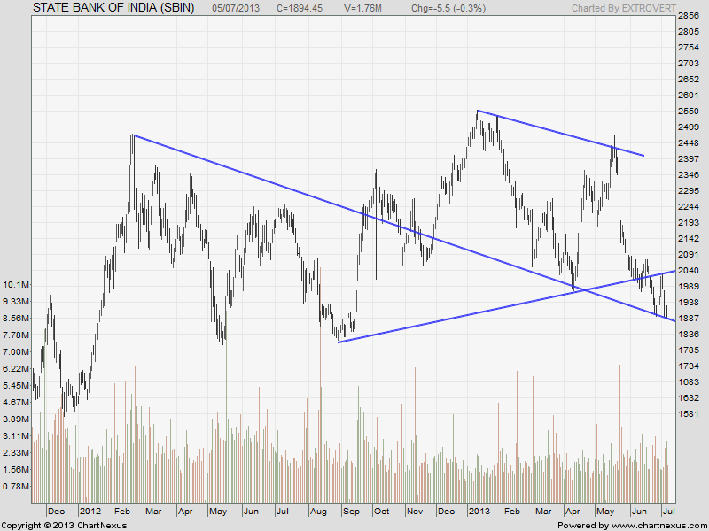 SBI is trying to hold its downward falling trendline support 1888, Any close below 1880 will give a short term targt of 1830 and 1741