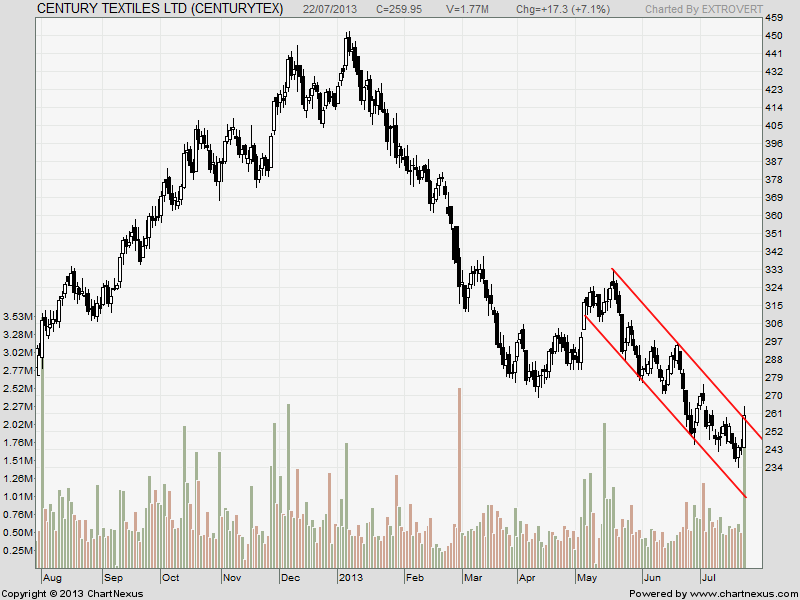 Century Textile after falling from past few trading session has seen some sign of life forming a bullish engulfing pattern,and also closed above FF level of 255 signalling continuation of up move.