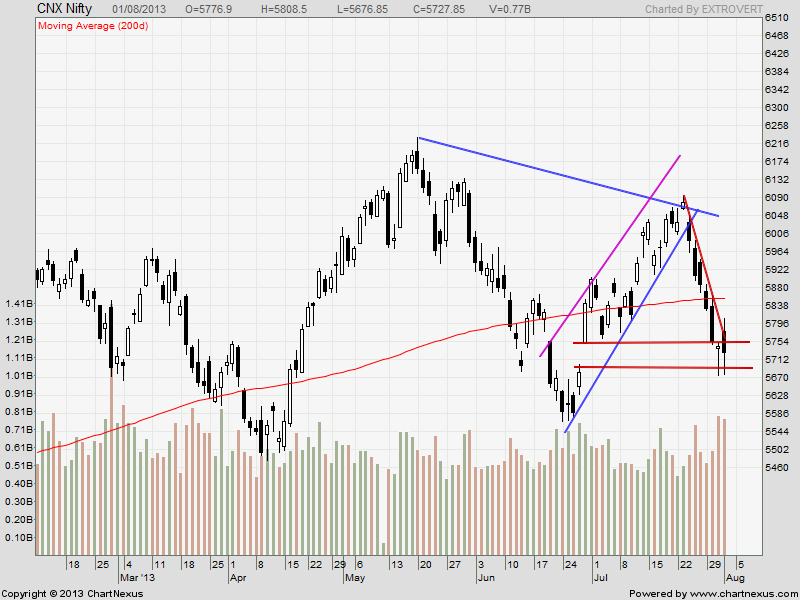 - Nifty opened gap up after Fed indicated no tapering in near future, but the sentiment were soiled by FT defaulting on payment of NSEL . Read more about Crash in FT. Nifty continued with its downtrend, falling for 7 consecutive day,Nifty has formed a double bottom pattern today, which is bullish pattern and we need a follow upmove above 5800 to confirm the same. As discussed in Weekly analysis Nifty Spot till it trades below 5900 bears will be in power and today we completed all the weekly targets :).
