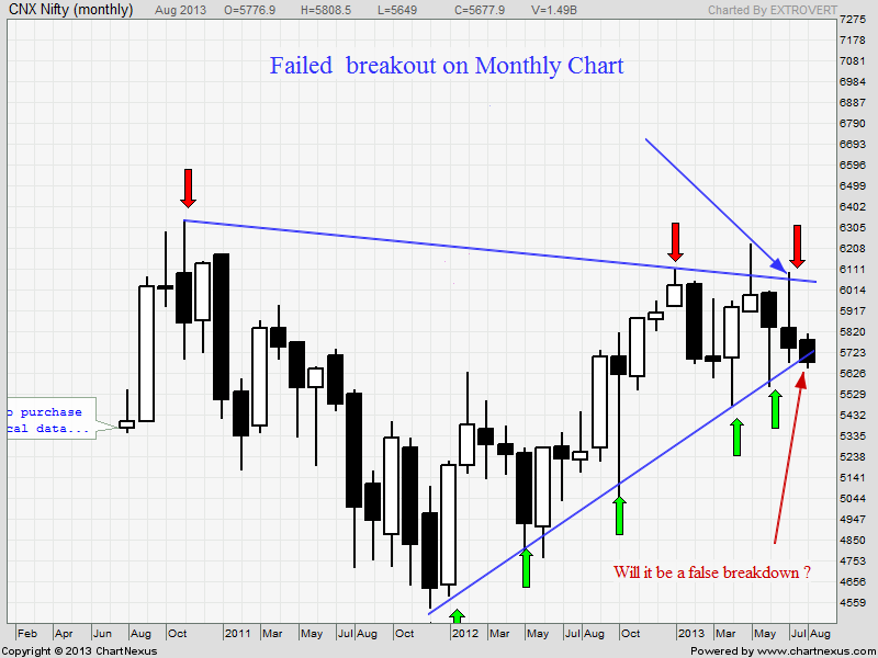 Monthly charts are near trendline breakdown zone. Will be get a breakdown or another whipsaw as was seen in breakout.