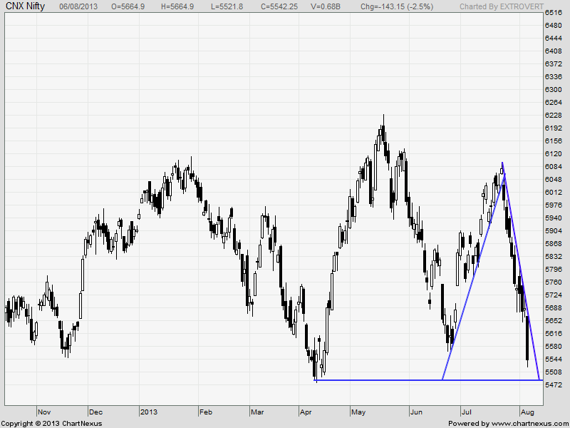 - It was black day for Indian markets as India markets out of trillion-dollar club market cap slips to $989 bn. Nifty broke 5550 and Sensex dipped below the psychological level of 19000. The story in mid cap stocks is heart wrenching as many of them are below 2008 low. Nifty last support remains in 2013 low of 5477 as seen in below chart. As discussed in Weekly analysis Nifty broke below 5686 and achieved all weekly targets in one day 🙂