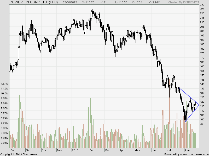PFC has been trading in symmetrical triangle and is approaching the breakout zone above 121.Any close above 123 will give short term target of 131. Unable to close above 123 after touching stock is correcting all the way back to 110.