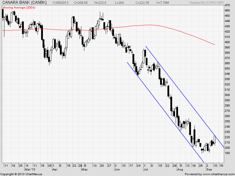 Canara Bank trading in perfect down trending channel, yesterday rise was backed by volumes and todays move can break the channel on upside.Positional traders should look for a close above 233 for target of 254. Any close below 212 will lead to a correction till 199.