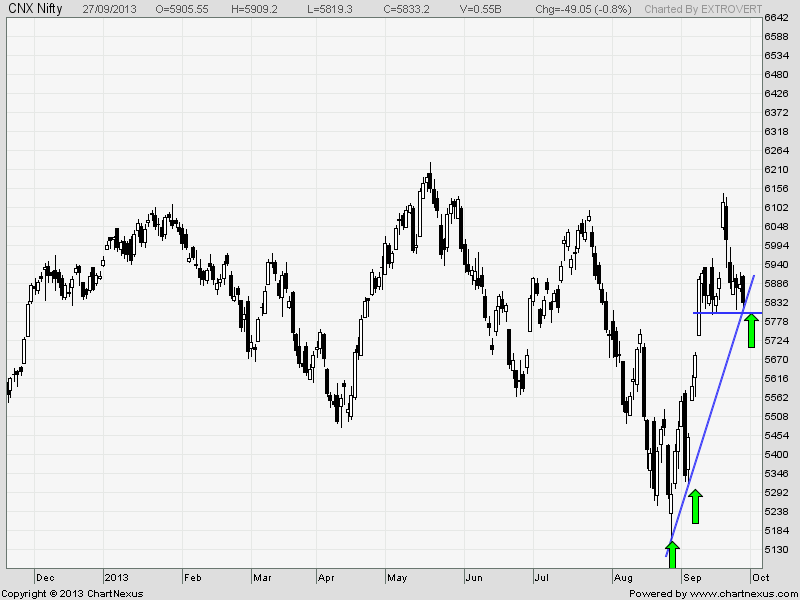 - Nifty continued to move in the trading range, today formed bearish engulfing pattern but it took support at the rising trendline. Monday’s price action will further unravel the mystery. Market moves will be choppy going forward till the range of 5798-5920 is not broken. We have monthly closing also on Monday bulls will like to close on higher end of range as September has been the best month of 2013. All thats starts well ends well 🙂