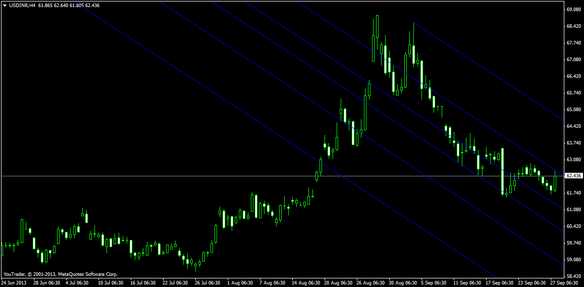 USD INR Hourly charts from MT4 platform are getting resisted at top of the Fibo channel any move above it can see rupee moving back to 64 odd levels.