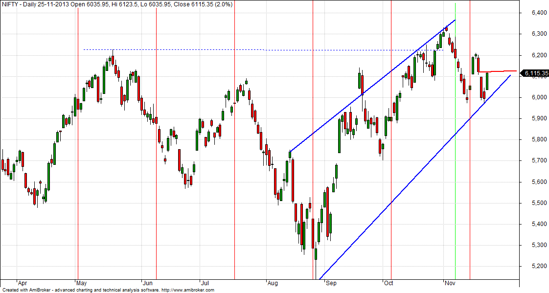 - Nifty showed the double bottom effect, and came up to fill the gap. Bullish move only on close above 6155 odd levels,below it can come down to 6050 odd levels.