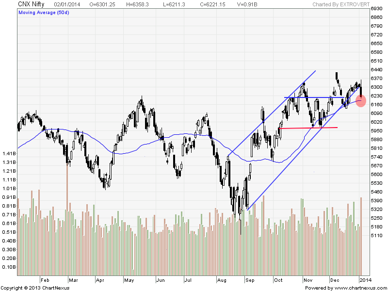 - As discussed in Weekly Analysis Nifty broke the Weekly trend changer level of 6326 and achived almost 2 targets. We have been discussing from past 2 days,as per time analysis we can see a sharp move of 2 Jan +-1 day and market obliged us today.Todays fall was more due to lack of FII participation, these kind of waterfall decline occurs on lack of downside limit orders. Nifty will again fall near an important support level of 6191, Holding the same we can see a bounce back till 6267,6284 levels. Trades who took short as per PAC today, part book.