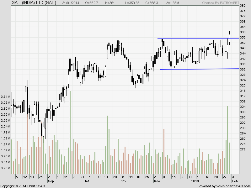 GAIL is shown a breakout above 361, Any close above 364 stock is headed to 369 and 377 in short term.
