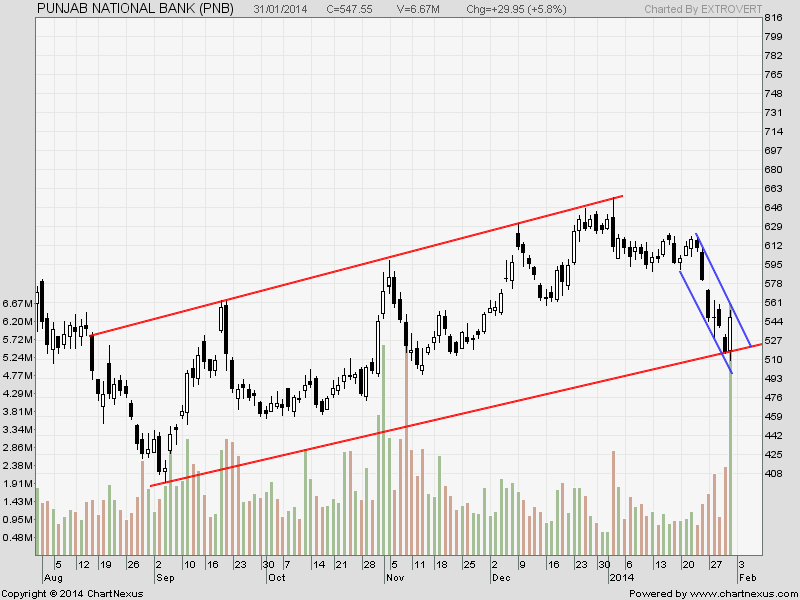 PNB has shown a rise with exceptional volumes,Positional traders should look out for close above 555,for short term target of 576 and 589.