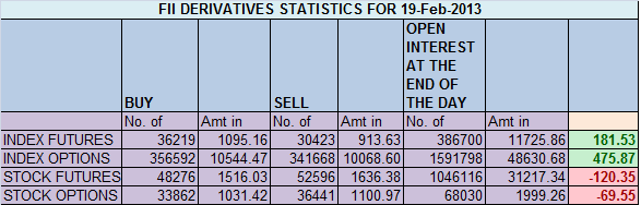 - Total Future & Option trading volume at 1.18 lakh with total contract traded at 1.2 lakh lowest volume in 2013, PCR (Put to Call Ratio) at 1.09 signalling overbought zone.
