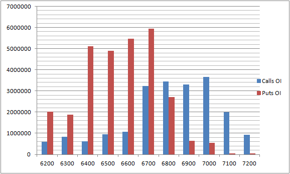 - 7000 Nifty CE is having highest OI at 36.5 lakhs , resistance for the market, 6800 CE with OI at 34.5 Lakhs,saw very minor liquidation of 2.9 lakhs suggesting Bears are still holding 6800 CE and we can see cool off near to 6800 odd levels. Call Options are not having high OI suggesting bears are on back foot. FII’s bought 6.8 K CE longs and 16.7 K CE shorts were covered by them.6300-7000 CE liquidated 15.4 lakhs.
