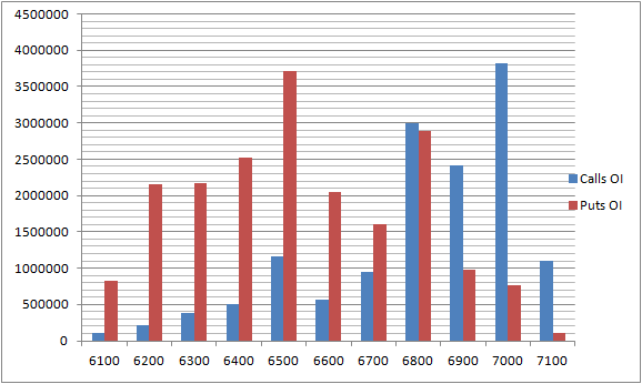 - 7000 Nifty CE is having highest OI at 38.1 lakhs , resistance for the market with 2.2 lakh addition, 6800 CE with OI at 29.8 Lakhs,saw addition of 2.1 lakhs suggesting bears are making positions on 6800 and it will be difficult to cross 6800. FII’s bought 2.5 K CE longs and 20.2 K CE were shorted by them.6300-7000 CE added 6.6 lakhs.