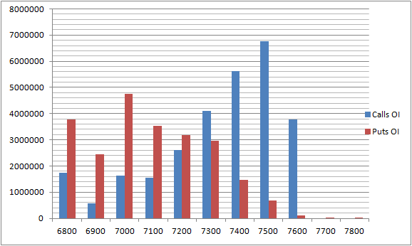 - 7500 Nifty CE is having highest OI at 67.6 lakhs followed by 7400 CE ,7400 CE is also having an OI of 50 lakhs and it seems smart money is selling 7400 CE. FII’s sold 13.3 K CE longs and 18.1 K shorted CE were covered by them.