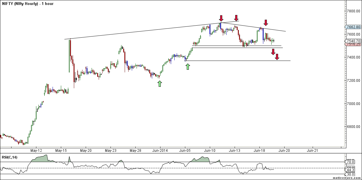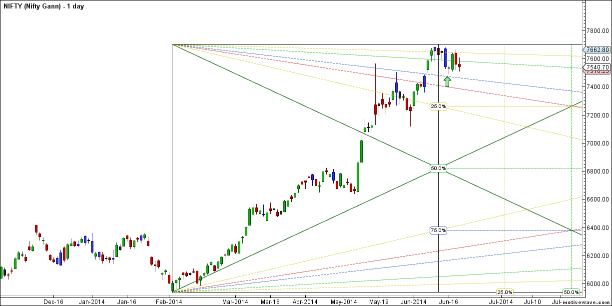 - Nifty has been sideways mode from past 10 trading session frustrating traders, On 06 June Nifty closed at 7583 and today it closed at 7540 so just a move of 40 points from past 10 trading session on closing basis, Sentiments in these 10 days went from Extreme Bullishness to Extreme Bearish with nifty showing volatile moves within range of 7700-7480.As shown in below chart, 7500-7520 range has been absorbing lot of selling pressure, once if it gets broken we can see a quick downfall towards 7470-7450 range.Also Gann chart shows Nifty not able to sustain above green line can see a fall till Blue line. Weekly closing tommrow Bulls will like to protect 7550 and bears would like to close below 7422.