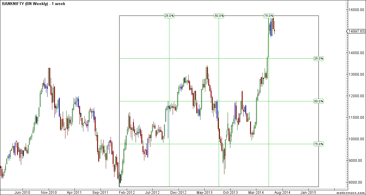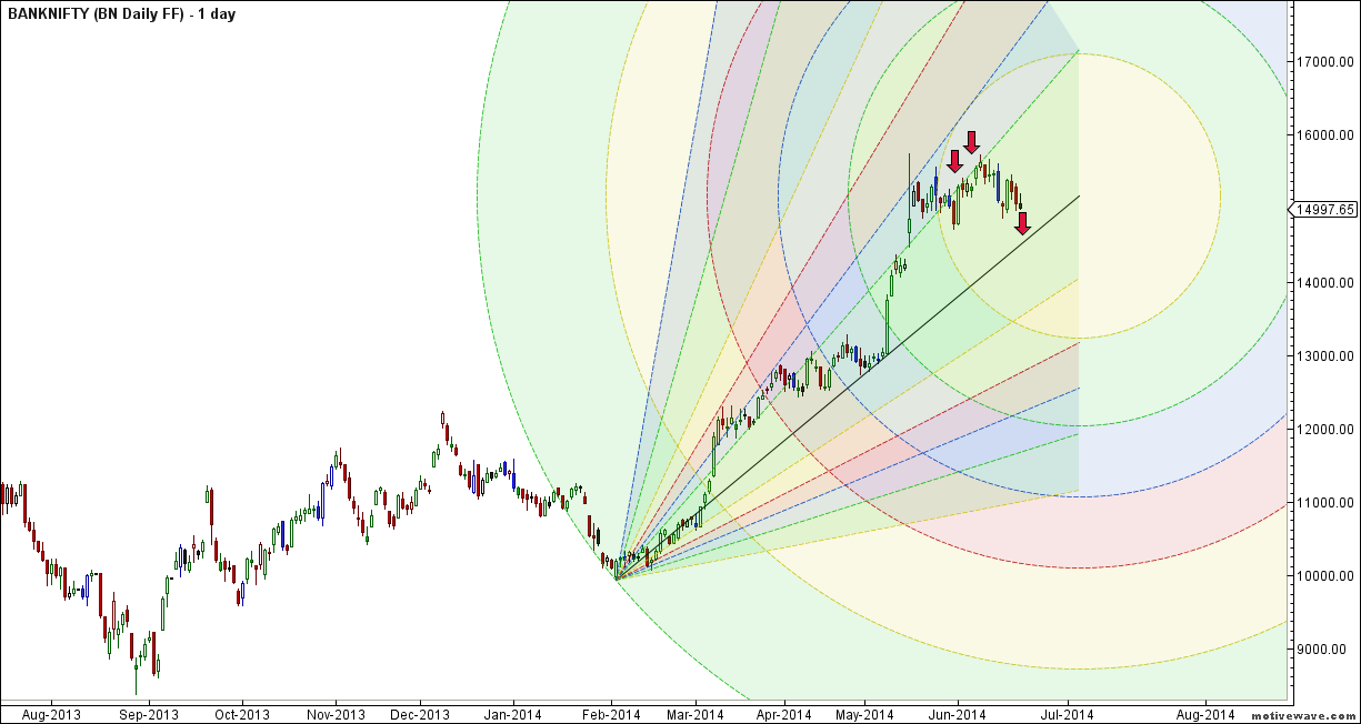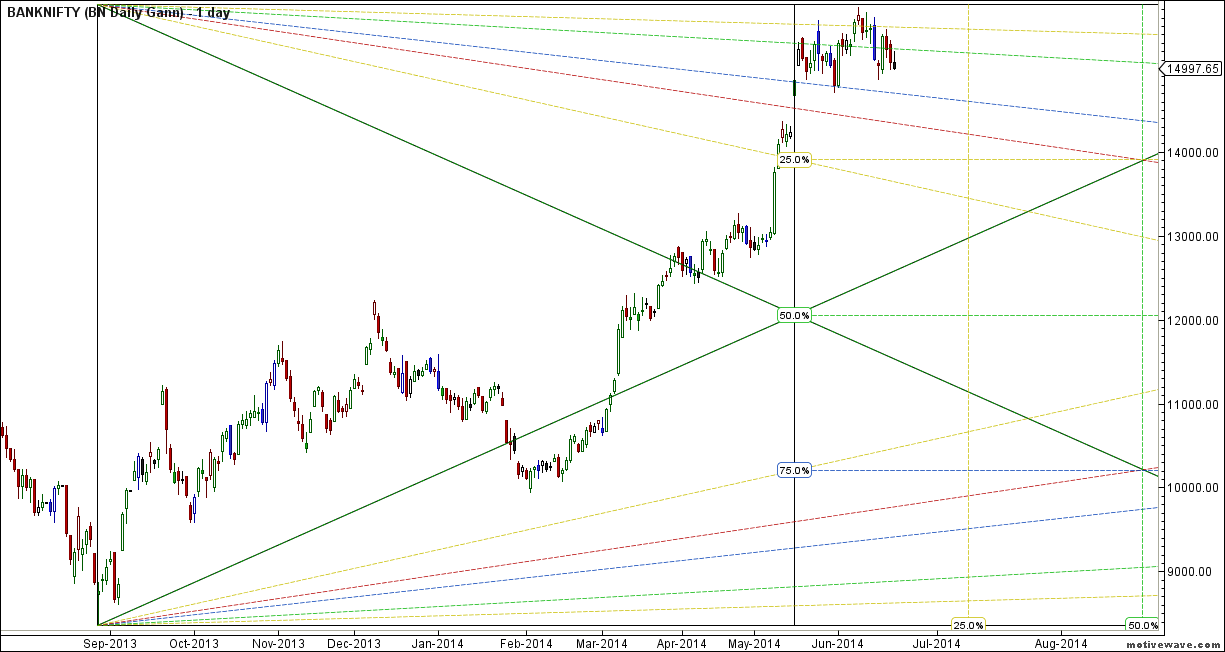 Bank Nifty Weekly chart is trading is 4 quadrant of Ratio box, which has range from 13800-15700 so long traders should be cautious as per gann grid. Any close above 15700 invalidate the current count and we will revisit the counts.