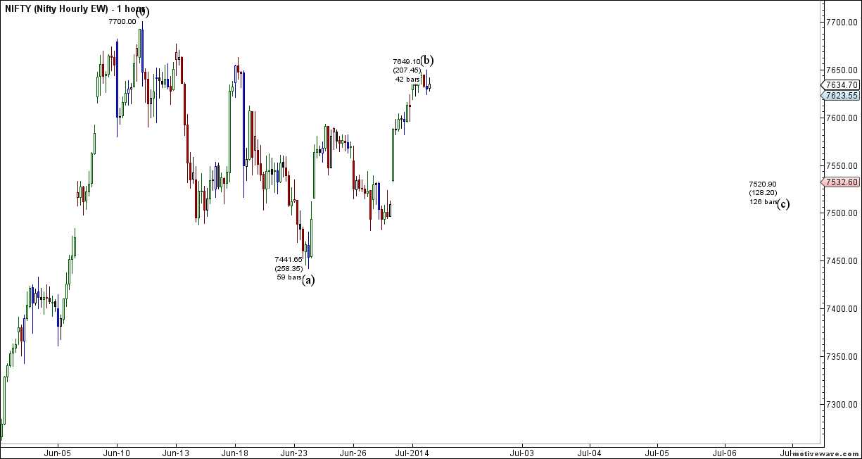 - Nifty after big move yesterday, consolidated its gain and closed well above 7600 levels. As per Elliot wave nifty might have completed the b wave of abc pattern today or tommrow opening can do and we can see a swift fall towards 7550-7520 odd levels, Any close above 7656 invalidates the pattern.