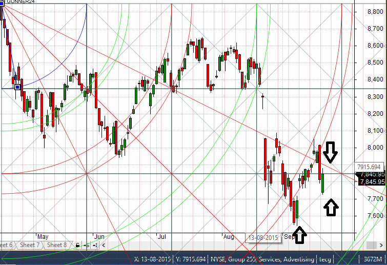 - Highly Volatile September Series came to an end, We saw high of 8055 and low of 7539 range of 516 points sentiments of traders moving from extreme negative to positive but overall from August to September expiry nifty moved just 81 points (Close of August Series 7948 and Close of September Series 7868) suggesting it was expiry for Option Writers. 7900 CE/PE combo was trading at 500 during September series has expired at just 32 Rs. For October series we need to close above 7958 for bullish move else any close below 7767 can see bears taking upper hand and nifty moving towards 7539/7422. Gann line will play crucial role as shown in below chart, also weekly trendline has been saved 2 times will it be lucky for 3 time ?