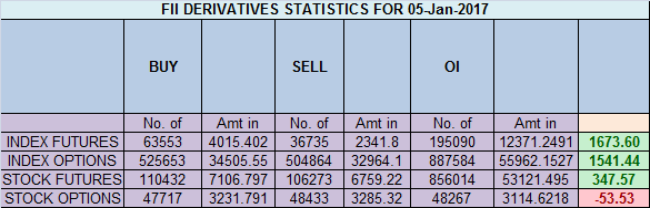 - FII’s bought 26.8 K contract of Index Future worth 1673 cores ,42.3 K Long contract were added by FII’s and 1.1 K short contracts were liquidated by FII’s. Net Open Interest increased by 5.1 K contract, so fall in market was used by FII’s to enter long and enter shorts in Index futures. Traders New Year’s Resolutions for 2017