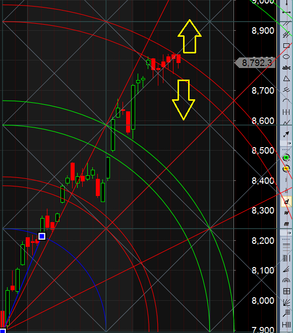 - As discussed in last analysis we are still holding 8681 suggesting bulls are still having upper hand eventhough we are not able to cross the gann arc, as shown in below chart. Bearish only on close below 8681 and bullish above 8840 in between choppy move continue. High made today was 8820 and low made was 8772 so we did not break 8840 on Upside and 8681 on downside suggesting choppy move to continue, Bulls should protect 8681 and till its protected move towards 8969 and above is quiet possible. Once the Gann arc as shown below is broken bulls will shown an impulsive move on upside. When we are near major supply zone as i have been discussing we see such choppy moves, more nifty consolidates in the zone faster and impulsive will be the breakout. 15 Feb is important date as per time analysis,hopefully we should see trending move tomorrow.Bank Nifty ready for trending move,EOD Analysis