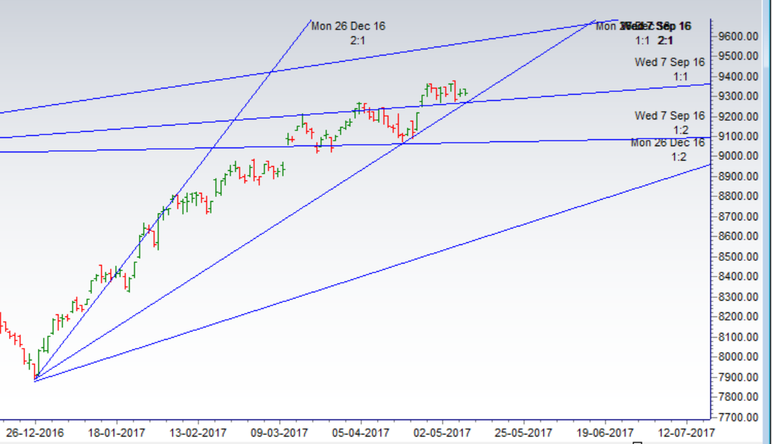 - As discussed in last analysis So we continue to trade in range of 9367-9270 near gann angle support suggesting both bulls and bears are fighting hard for the range expansion. As per time analysis May 11 is important date. We are approaching the end of sideways time cycle, get ready for a trending move in next 1-2 days.Trend trader should wait for range break for move towards 9425/9460 on upside and 9220/9170 on downside. Bank Nifty ready for big move,EOD Analysis