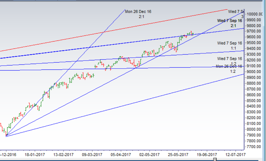- As discussed in last analysis Nifty saw small correction today and closed just near the gann angle also also near the lower end of range at 9640, bulls need to hold the gann angle for upmove to continue towards 9750/9790. Bearish below 9610 for a move towards 9530/9480. Low made today was again 9630 near the gann angle, and again we saw bulls coming back, and closing above 9663 forming long legged doji. Till Bulls close above gann angle they have upper hand an\d can push nifty towards 9750/9790. Bearish below 9610 for a move towards 9530/9480. As per Geometric Time Cycle big move can be seen in market in next 2 days. Bank Nifty does 23600 holding gann angle, EOD Analysis