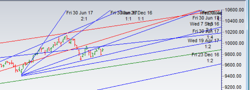 • As discussed in last analysis    More shorts can be added below 9740 for a move towards 9642. Nifty again fell from gann angle resistance zone as shown in below charts.  Long should be done above 9950 for a move towards 10025/10090/10150. Bearish below 9880 for a move towards 9820/9770/9730. We have expiry tomorrow and again price is near the major gann angle from which it has fallen 3 times, also price is stuck in 2 gann angles, suggesting explosive move round the corner. Bank Nifty Aug Expiry Analysis