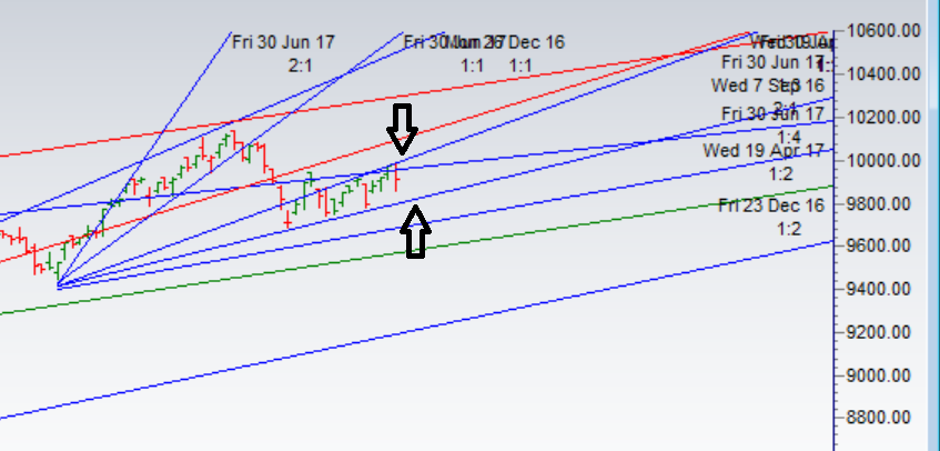 - As discussed in last analysis Also price is stuck in 2 gann angles, suggesting explosive move round the corner. Long in September series should be taken above 9950 for a move towards 10090/10150/10280. Bearish below 9850 for a move towards 9770/9685/9610. Range of 10026-10030 is very important range close above it we can quickly rally till 10090/10157/10235. Bearish below 9900 for a move towards 9820/9770/9710. Nifty bulls got stopped out as price went below 9950 and bears also got stopped out as price break 9900 but failed to do 9820 as low made was 9861. As seen in below gann angle chart, price is struck in 2 gann angles trading from higher end towards lower end. Breakout above higher end of gann angle above 10000 breakdown below the lower end at 9840, in between it will trade between the range, Breakout above 10030 for a move towards 10090/10150/10237. Bearish below 9840 for a move towards 9740/9685. Bank Nifty trading set up amid geopolitical tensions