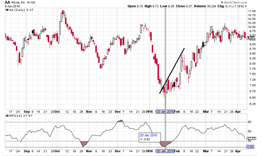 As shown in below chart 20th Jan 2016 Money Flow Index (MFI) touched 0.92 as we have discussed the Money Flow Index (MFI) below 10 is not sustainable and if we get a confirmation from a reversal candlestick it makes a case for going Long in Aloca Inc.