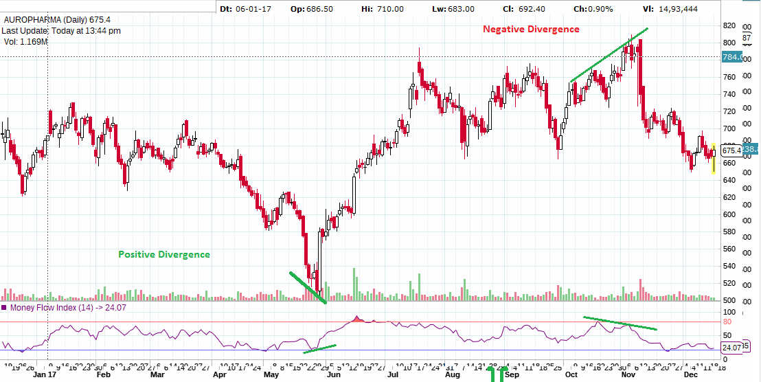 On the Aurobindo Pharma below, a bullish divergence can be seen when Price was making Lower Lows in June 17 month but MFI was making Higher Highs as shown below. As shown below Divergence did show the effect and From low of 544 till 760 till MFI became overbought touching 80 range. Bearish Divergence also shown in below chart.