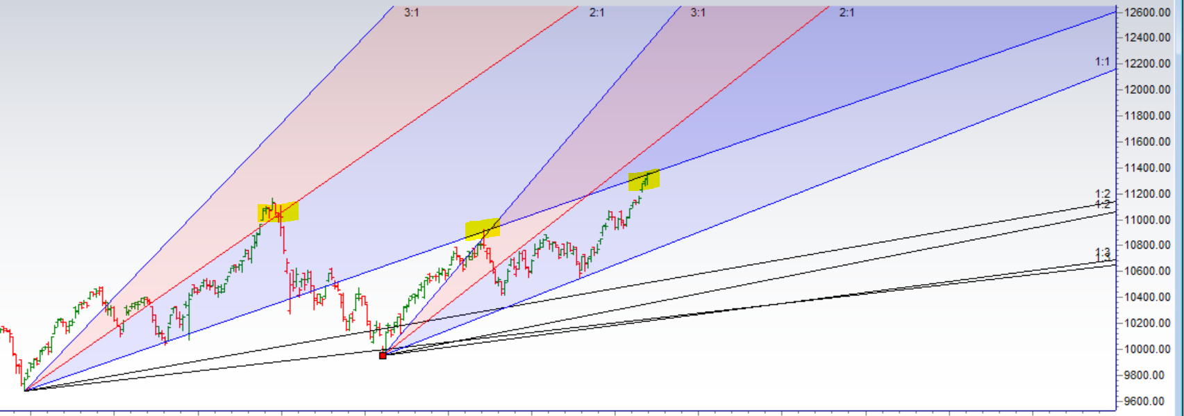 - As Discussed in Last Analysis High made today was 11328 so bulls continue to hold 11230 and now heading towards 11343/11396/ till we are holding 11230. Bulls need to start getting cautious as we are approaching the zone of resistance of 11376-11400 , where we can see profit booking. Bearish below 11230 only for a move back to 11185/11125/11060. High made today was 11366 at gann angle resistance bulls should book out and tighten SL to 11250 Bulls need to start getting cautious as we are approaching the zone of resistance of 11376-11400 , where we can see profit booking. Bearish below 11230 only for a move back to 11185/11125/11060.Beauty of gann analysis is shown below perfect move from 1 gann angle to another. Important intraday time for reversal can be at 12:31/2:40. Bank Nifty forms Inside bar pattern,EOD Analysis