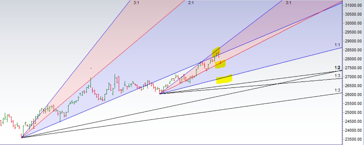 - As Discussed in Last Analysis Bank Nifty broke 28200 and and almost did our 1 target. Now till we are below 28200 bears have upper hand and can push index all the way till 27940/27792/27648.Bullish above 28400 for a move back to 28512/28650. Time cycle date has shown effect and we can see fall of 200-300 points easily till we do not break 28377 time cycle date high. Bank Nifty closed below 28200 on Time Cycle Turn Date,Friday and as expected gave a 300+ point fall in gap down doing our target of 27792 and we closed at gann level support as shown in below chart. Now Bears need to break 27734 for a move back to 27650/27556/27484. Bullish above 27820 for a move back to 27920/27984/28064.Important intraday time for reversal can be at 1:10/2:46. Trading With Your Own Money