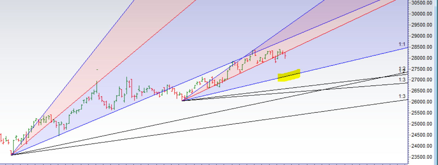• As Discussed in Last Analysis  As we have time cycle date today so break of 28151 we should easily see a move of 150-200 points on downside  28000/27920/27739 and if break of today high 28344 we can again see move of 150-200 points towards 28512/28656.  We got the expected 150 points down move below the time cycle low of 28151.Till we are below 28151 bears have upper hand can push index towards 28000/27920/27739.Bullish above 28225 for a move back to 28344/28512/28656.  Important intraday time for reversal can be at 10:17/2:34. Honored to be part Online Trading Summit